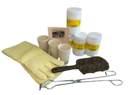 Package includes, 3 40g (or #5) crucibles, 5lb of borax glass, 2lb of sodium carbonate, 2lb of silica powder, 6 cone pouring mold, 18" furnace gloves, general purpose 18" (or #5) scissor tongs, & general knowledge book for refining.